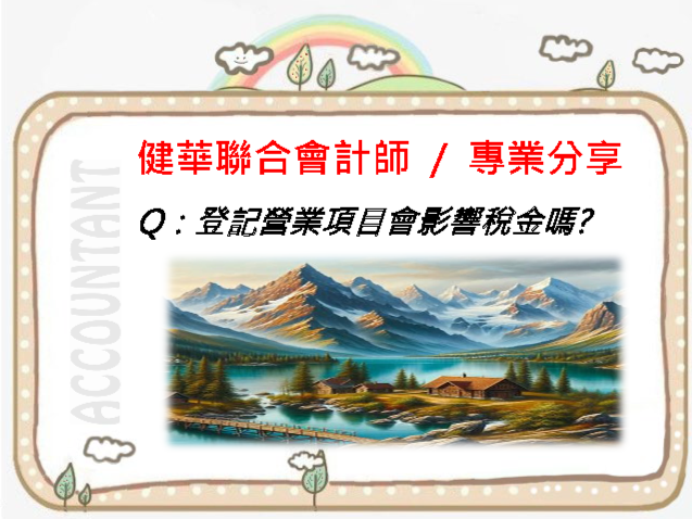 2.登記主要的營業項目排列順序,實務上會影響後續營利事業所得稅申報的純益率;間接影響繳稅多寡。因此有經驗的會計師事務所都會做適當的安排,避免客戶繳了冤枉稅。